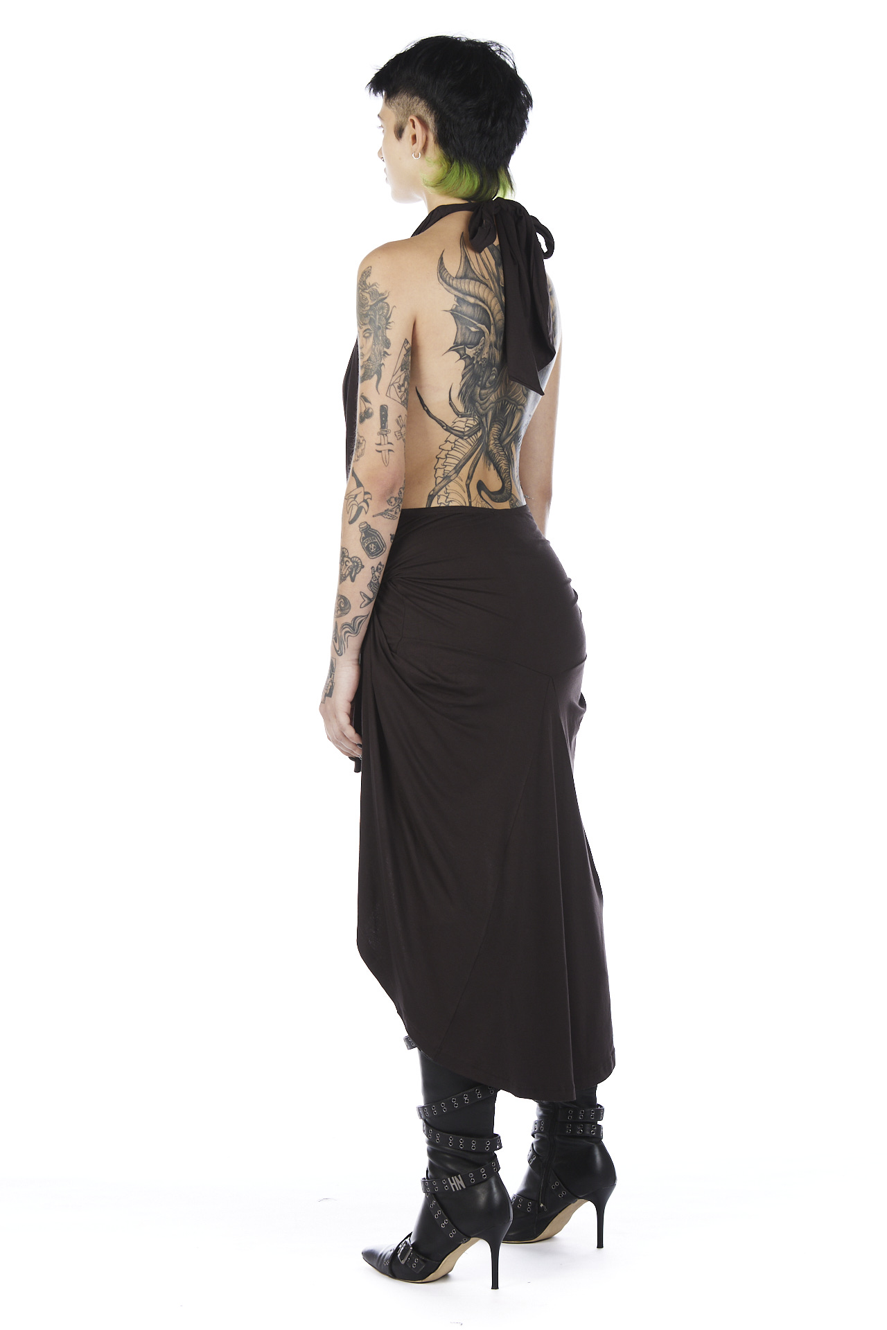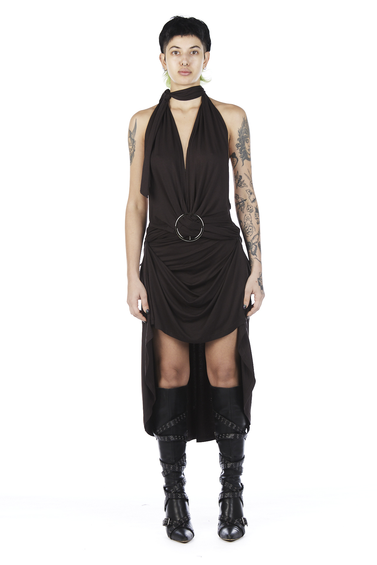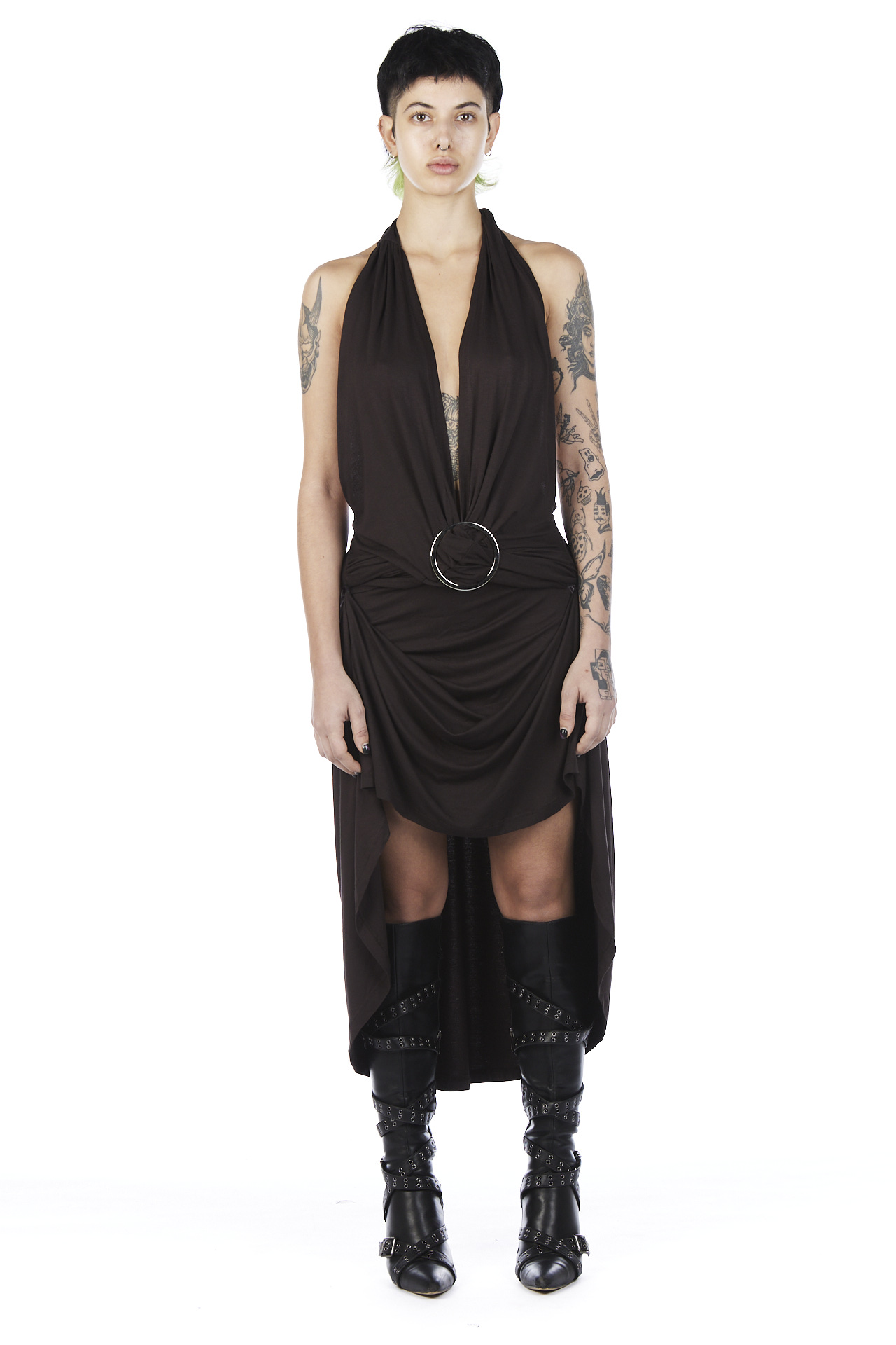 This loose brown dress, crafted from espresso brown & black viscose silk jersey, features an open back and a striking open neckline, accented by a silver buckle detail. The extended back hem brings a contemporary edge to its loose fit, creating a chic, flowing shape.