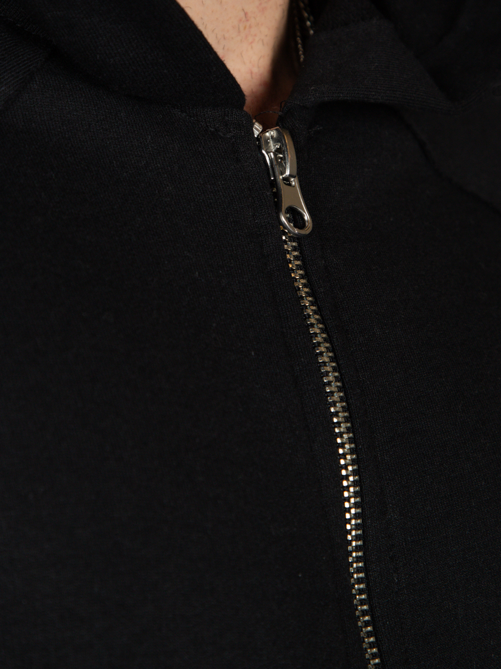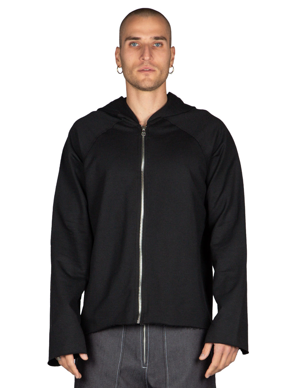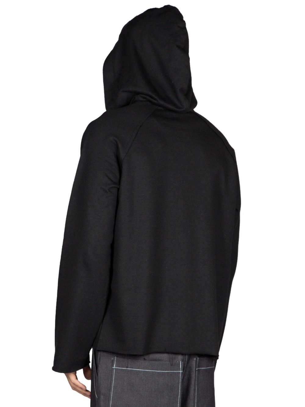 This light-weight hooded jacket features an exposed front zipper and wide sleeves. The jacket’s raglan sleeves and hem have a raw-cut finish. On both sides, the design features two seams extending from the neck area to the side edge. There is also a bold seam on the hood.