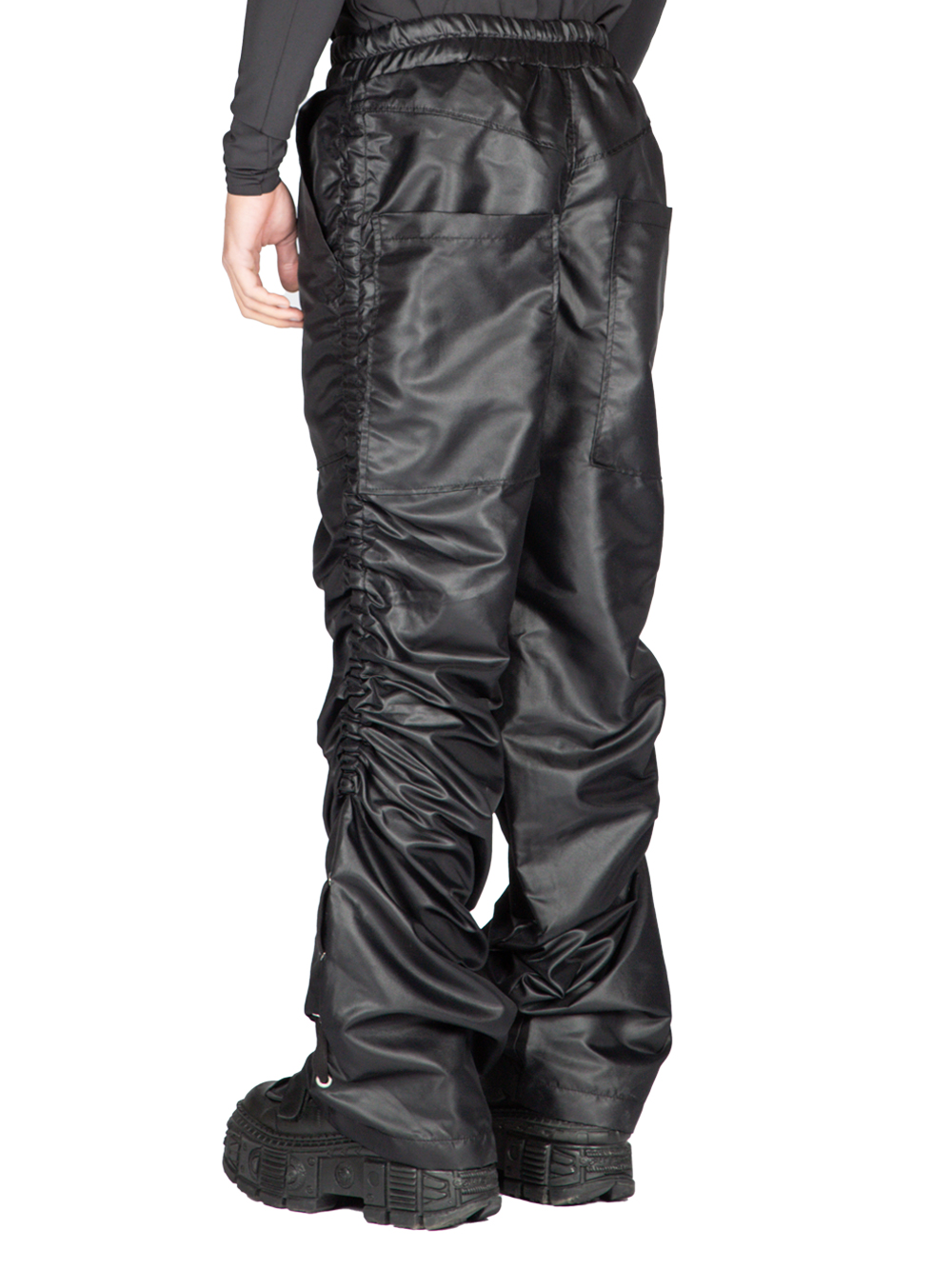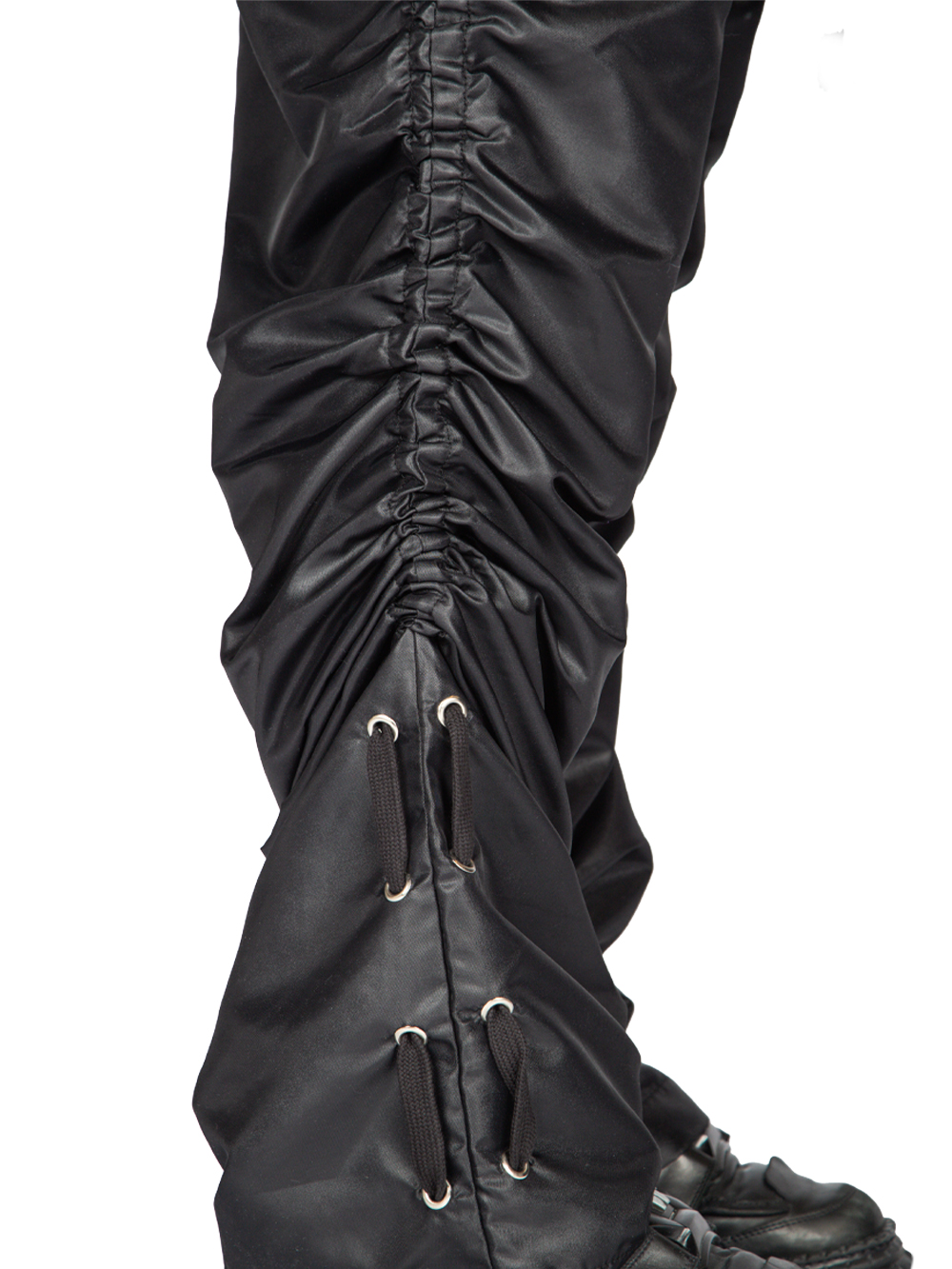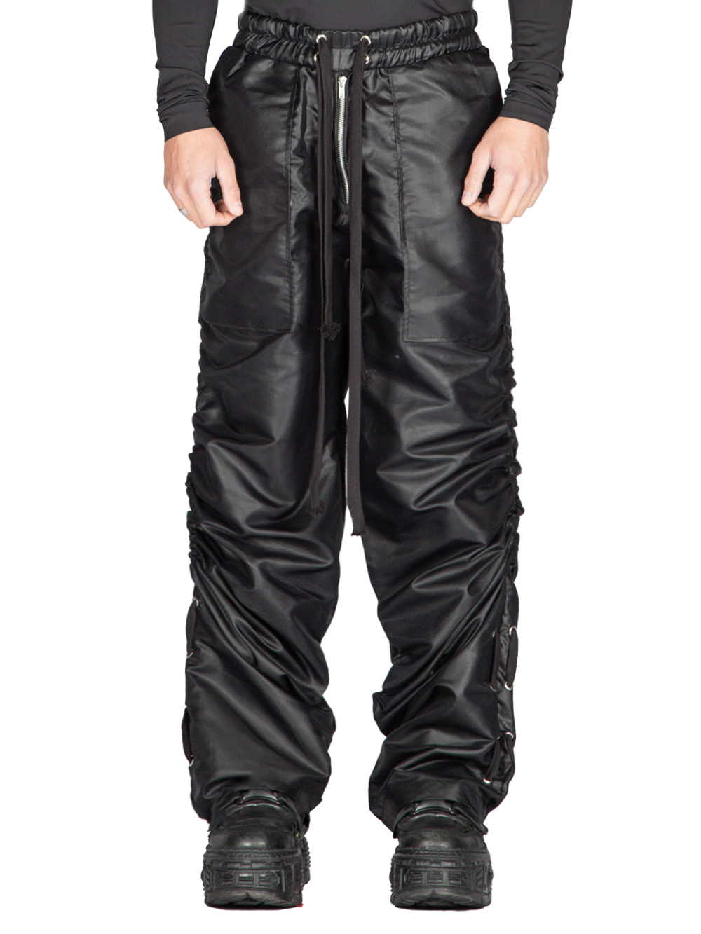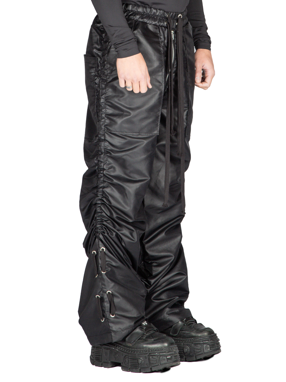These lightweight bootcut pants feature side strains with metallic details and an elastic waistband. The design includes layered front pockets and two square back pockets. The pants also provide an exposed centre zipper.