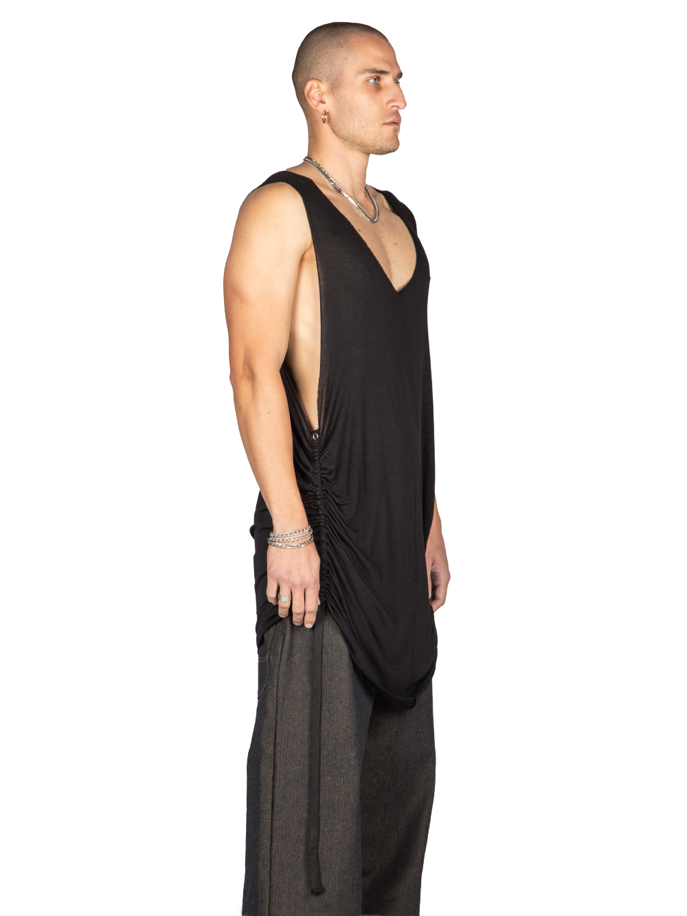 This knitted, semi-transparent long tunic falls below the hips with a loose fit. It features exposed shoulders, with raw cuts at the neck and underarms. Ruffled sides with drawstring ties and metal hoop detailing create a gentle lift throughout the design.